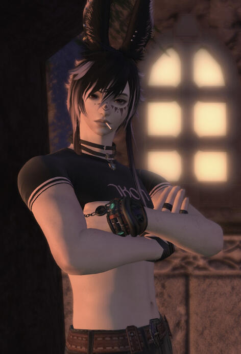 Fiver Nimh is an archer, healer, and single dad carving out a life in Ul’dah—no longer bounty hunting, but never fully out of the woods. Mornings start with target practice at sunrise, clearing his head before a long day at the city’s free clinic, working under gruff old Jack Crusher—his mentor, and sometimes, his compass.He closes his nights tending bar at Wysteria, patching up club kids and drunks, keeping his world running on caffeine, clove cigarettes, and too little sleep. When the lights go down, he writes letters to his son Pip, or messes with lyrics he’ll never sing for anyone but himself.Fiver’s roots are tangled. He’s Gylkah—born to a hidden, blended tribe where politics matter more than people, but family can still bend the rules for a matriarch’s son. He’s welcome, just not quite one of them anymore; visits are all sidelong looks and careful silence.Blunt and quiet, Fiver keeps his distance, more out of habit than pride. Social anxiety claws at him—sometimes literally, leaving scars behind his neck and on his forearms. He fidgets, scratches, or jingles his bracelets when nerves hit; his ears say what he won’t. He smokes too much, avoids alcohol and anything stronger, and never shakes the sense that he’s undeserving of easier days.His loyalty runs deep, but trust is slow—friends get rare flashes of warmth, and his softest side is saved for his son. He’ll spend his last gil to keep Pip’s world gentle, even if it means running himself ragged between jobs and family.If you want to be Fiver’s friend, patience is key. He keeps his distance at first, always reading, always weighing—trust isn’t cheap. But once he lets you in, it’s for keeps. You’ll have his loyalty long after you’ve earned it, whether you’re ready or not.